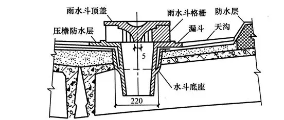 安裝雨水斗時,是將其安放在事先預留的孔洞內。屋面防水層應伸入環形筒下,雨水斗四周防水油氈彎折應平緩;雨水斗下的短管應牢固固定在屋面承重結構上,以防止由于屋面水流沖擊以及連接管自重的作用而削弱或破壞雨水斗與天溝溝體連接處的強度,造成接縫處漏水。雨水斗的安裝如下圖所示。